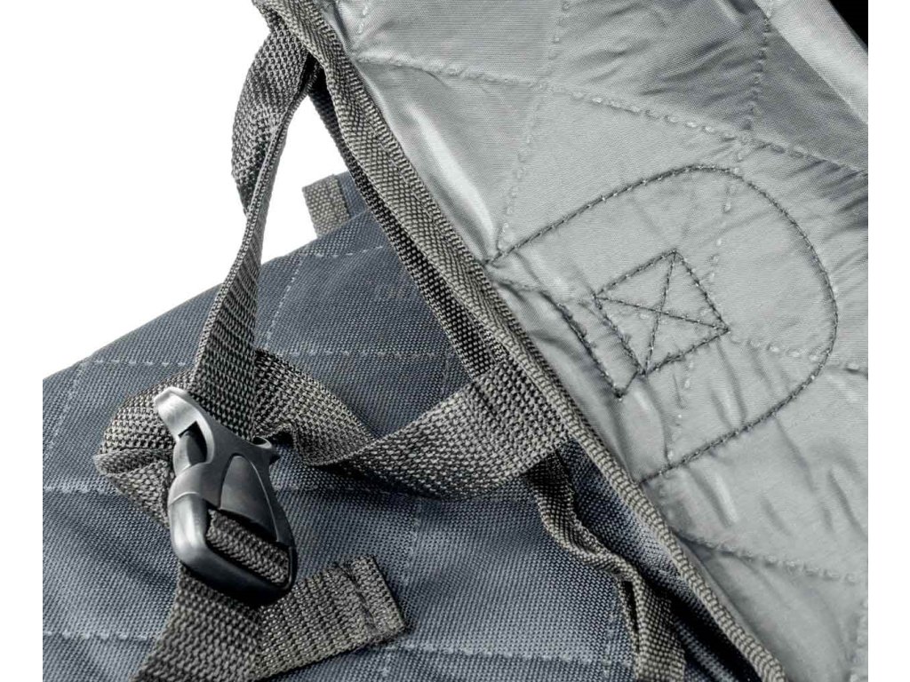 Podložka má tři vrstvy včetně nepromokavé vrstvy na spodní straně, která zajišťuje, že se vlhkost nedostane na dno kufru, a protiskluzový povrch, díky kterému má pes pevný postoj při cestování.
